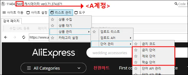 1) 메인으로 사용하는 A계정에만 단어 설정 리스트 등록