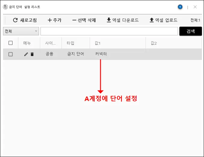 → B계정 단어 설정 리스트에 금지 단어 개별 추가