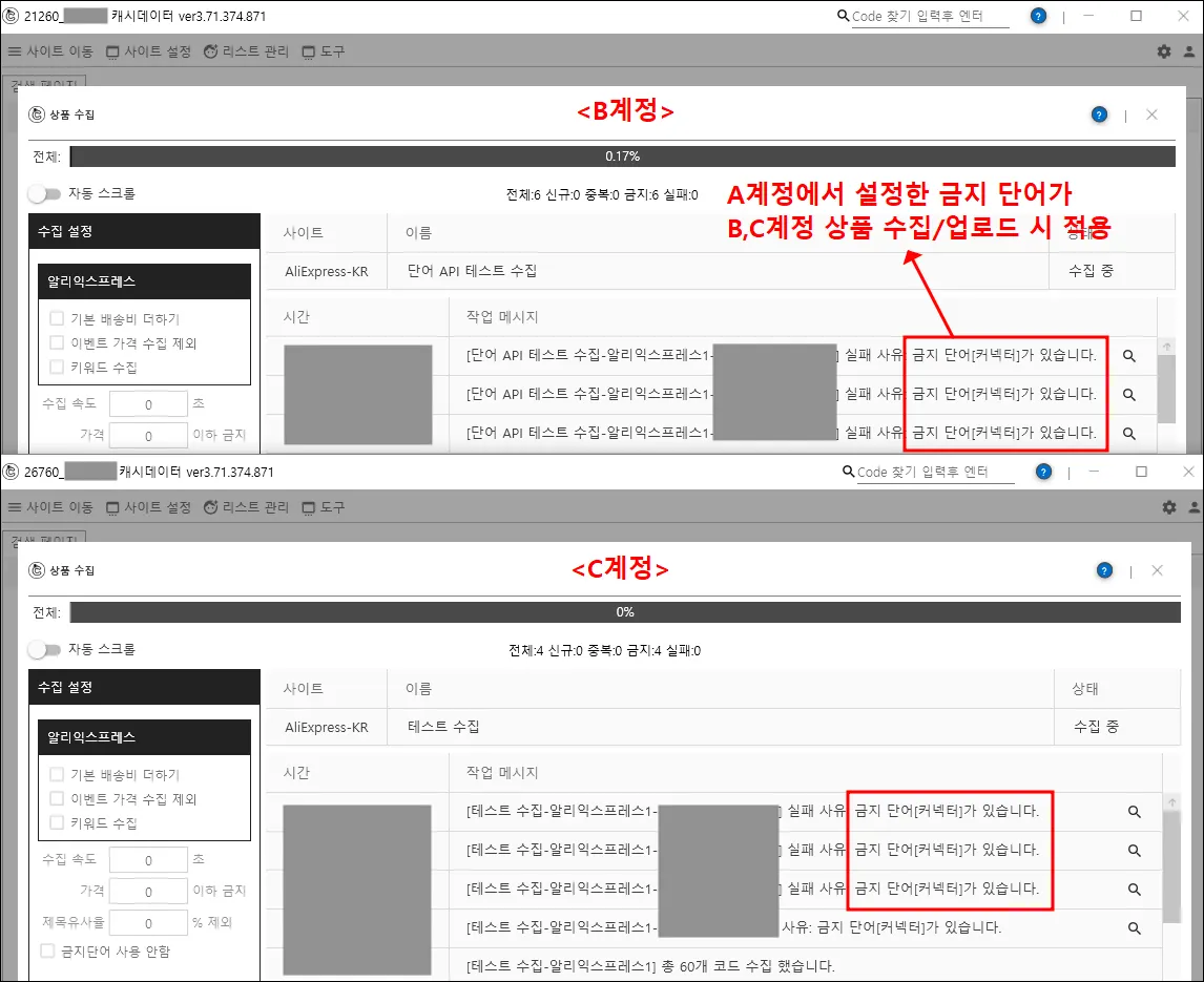 ⇒ B,C,D 계정으로 수집/업로드할 때 A계정의 단어 설정이 적용