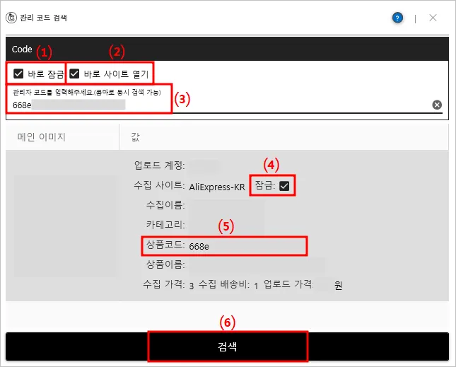창 설명 : 업로드한 상품을 상품 코드로 검색하여 원 소싱사이트 이동, 잠금 설정을 할 수 있는 창