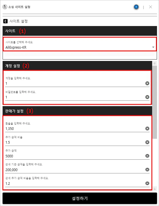 소싱 사이트별 판매가 설정, 배송비 등을 설정하는 창