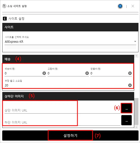 창 접속 방법 : [사이트 설정] - [소싱 사이트] - [설정]