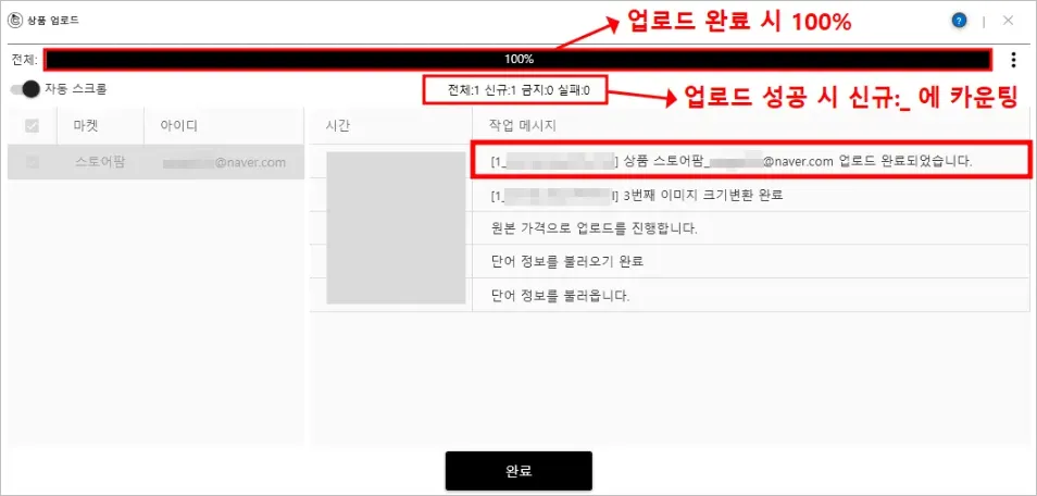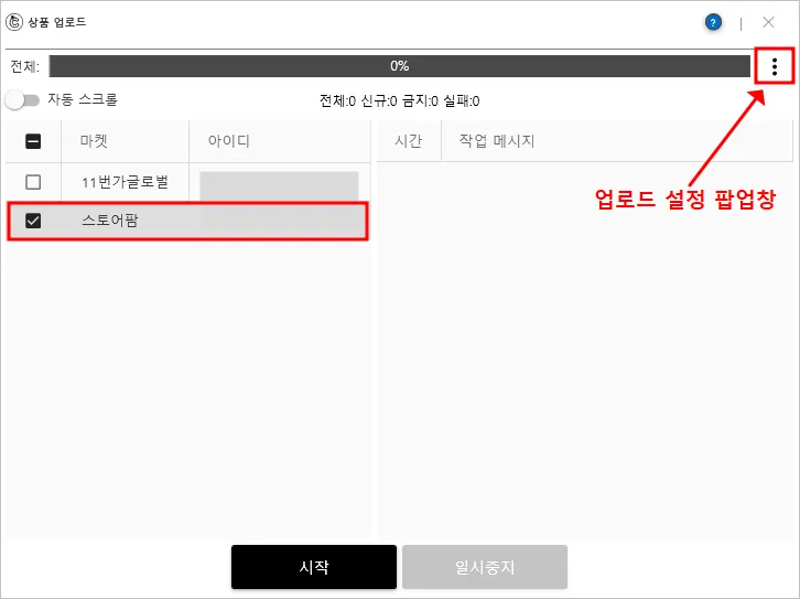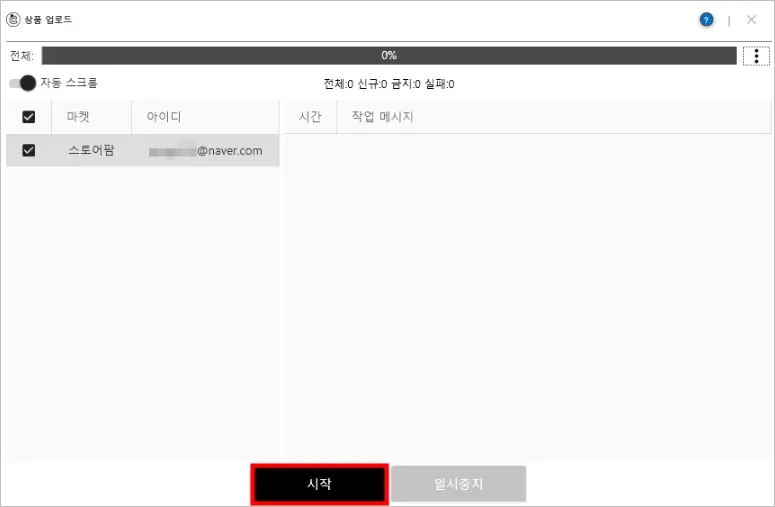 4. 업로드 설정이 완료되면 시작 버튼을 눌러 업로드를 시작합니다.