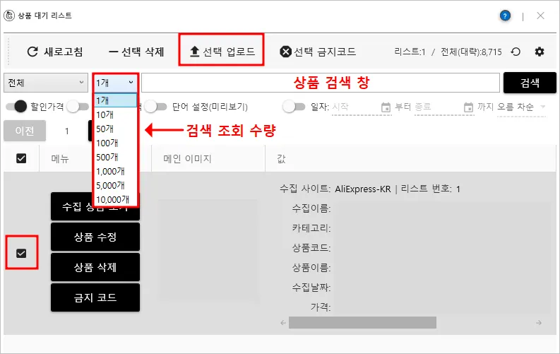 2. 업로드 할 상품을 조회하여 체크박스 체크 후, 선택 업로드를 클릭합니다.