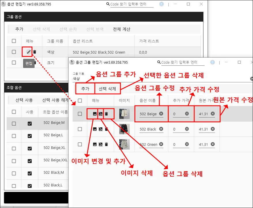 : 옵션 그룹 추가/삭제/이름 수정, 옵션 이미지 추가, 변경 등 옵션 그룹을 편집할 수 있는 창