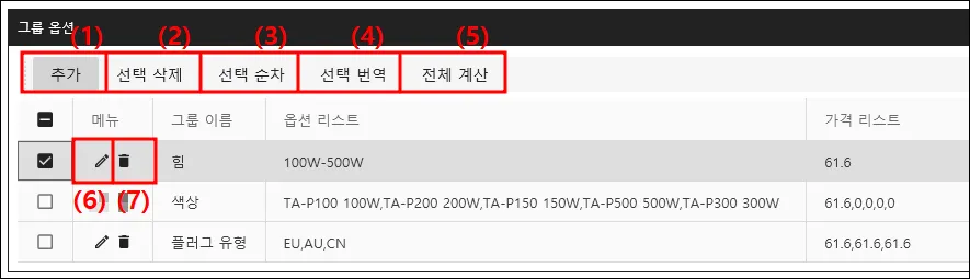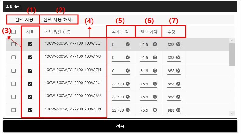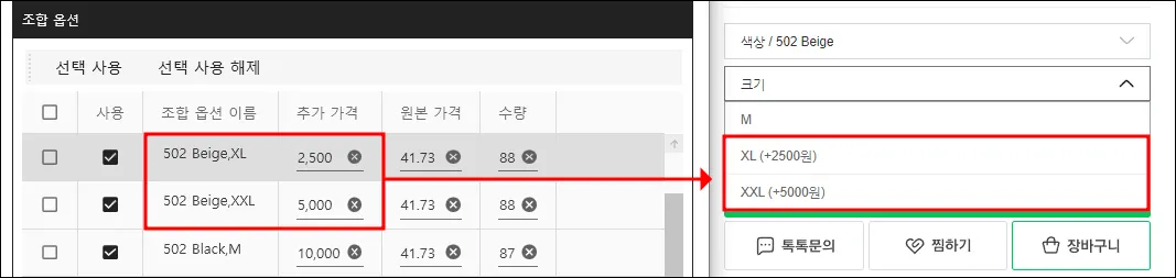 추가 가격 : 실제 마켓에 업로드되는 옵션의 추가 가격 (한화 기준)