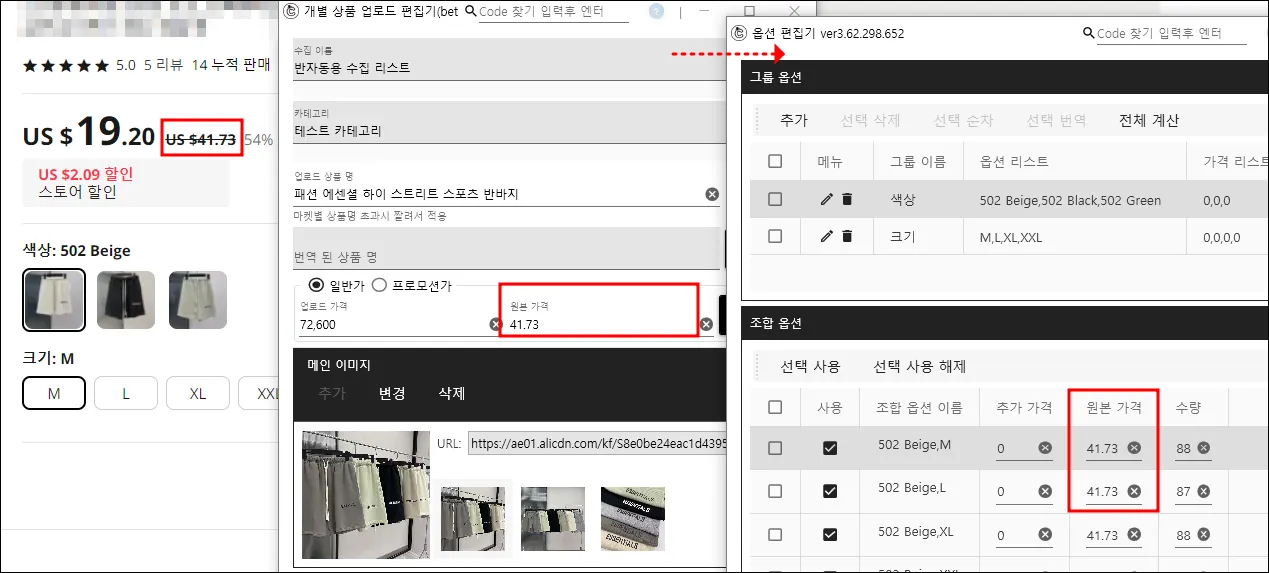 원본 가격 : 소싱 사이트에서 수집한 옵션의 원본 가격 (소싱 사이트 환율 기준)