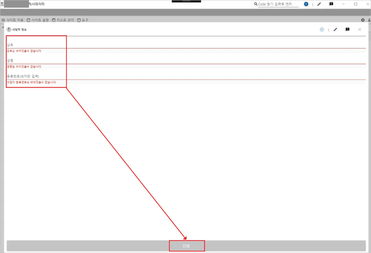 2. 사업자의 상호, 성함, 사업자등록번호를 입력한 후 인증 버튼을 클릭합니다.