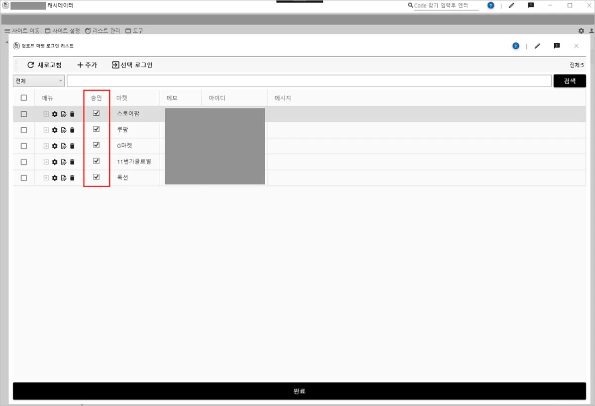 동일 명의 사업자의 마켓 아이디를 추가했는데 승인 박스에 체크되어 있지 않다면,