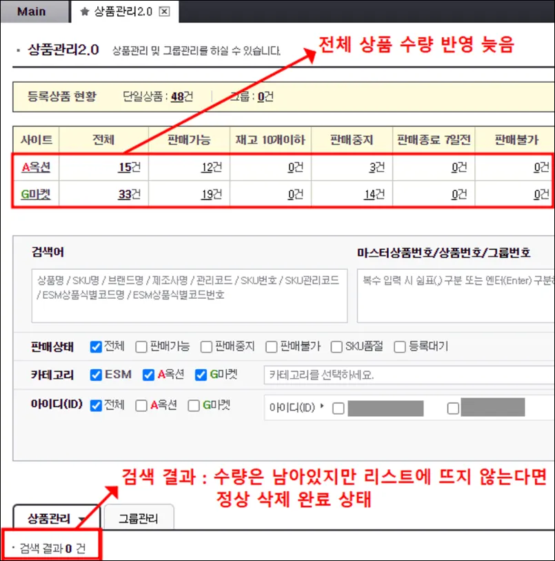 업로드 리스트 + ESM 검색 결과 리스트에 상품이 없다면 정상 삭제는 완료된 상태입니다.